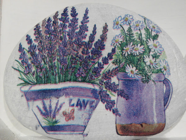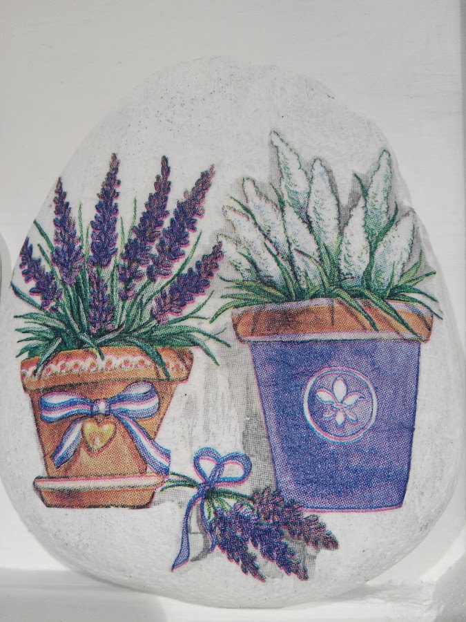 Las pinté con Chalky blanca. Luego decoupage con la servilleta. Y por último una capa de barniz para protegerlas si les cae agua del riego o de la lluvia. No se estropearán así.