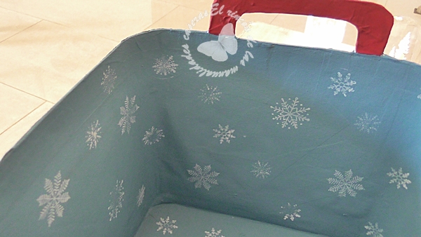 El interior lo he pintado con pintura acrílica del mismo tono que el fondo de la servilleta y le he estampado unos copos de nieve. Y ya se puede barnizar.