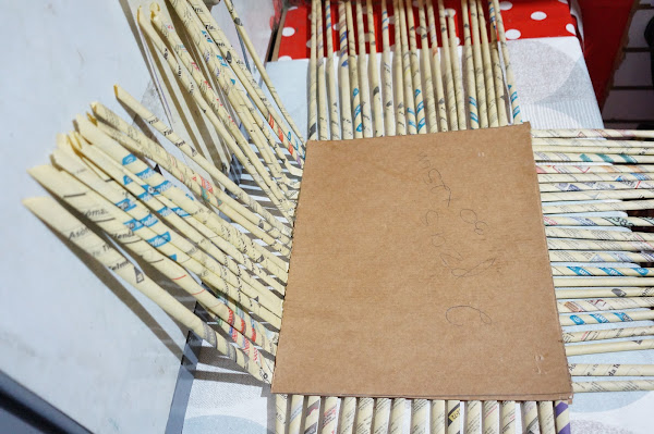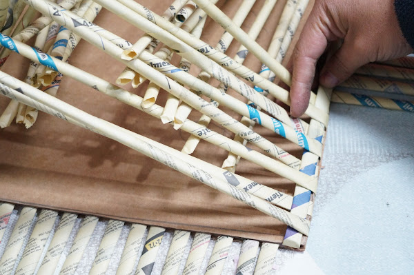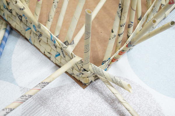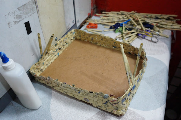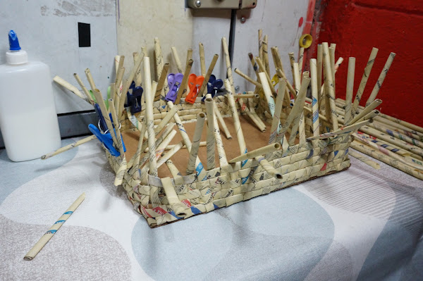 Ahora trenzaremos estos palitos de papel, y añadiremos en ellas otros más, para completarlo y as´poder hacer las asas para sostenerlo. Lo pegaremos y dejaremos secar, lo mismo haremos con el segundo