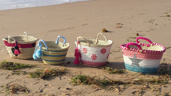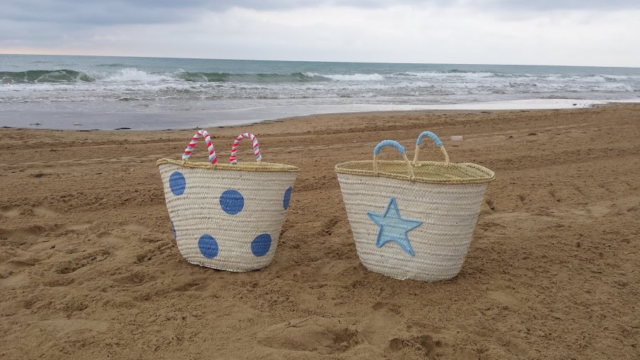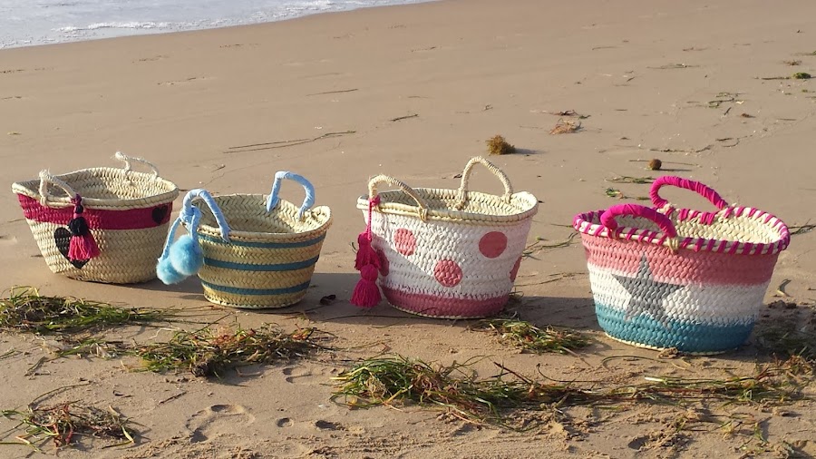 Capazos de diferentes tamaños y diseños pintados a mano. El resultado es un variado conjunto de cestas perfectas para hacer juego e ir conjuntada.