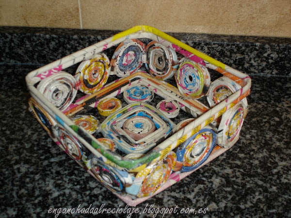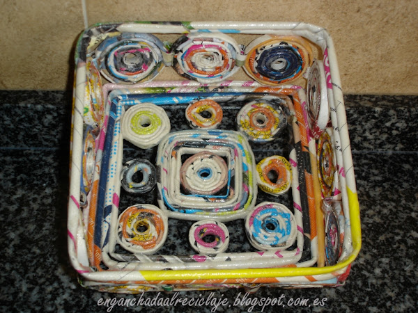Para hacer las espirales enrollé los rollitos a un rotulador para que quedara el círculo del centro abierto y las uní entre sí con pequeñas tiras de revista dobladas. Las pegué a la base con silicona y seguí añadiendo rollitos para pegarlas también por arriba y hacer el borde superior.