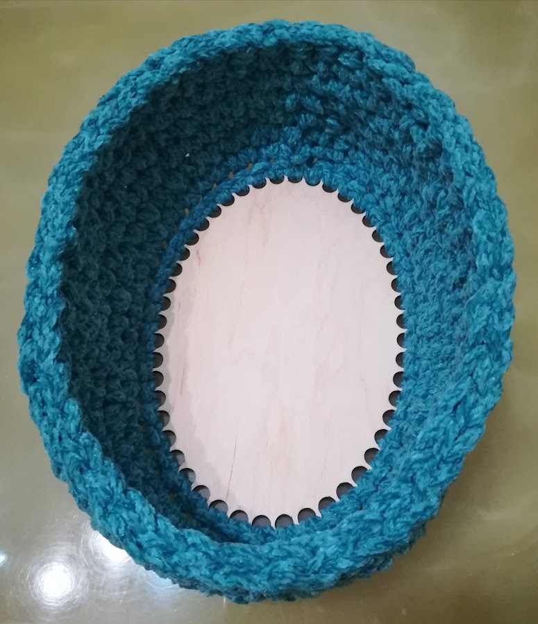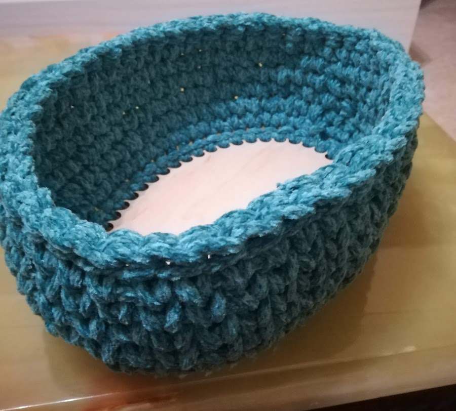 Esta semana os traigo, esta cestita, tejida con velvet de 6 cabos, con una base de madera. Tejida a punto bajo, cojiendo la hebra por el medio de la uva que hace el punto.