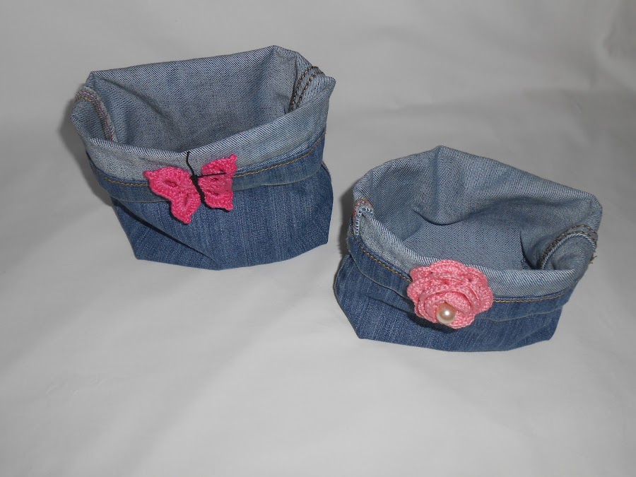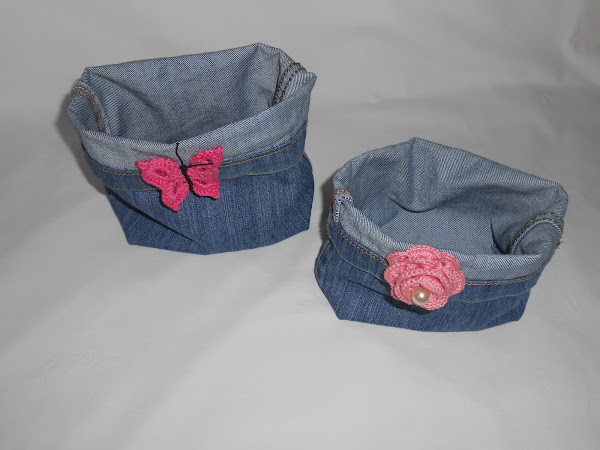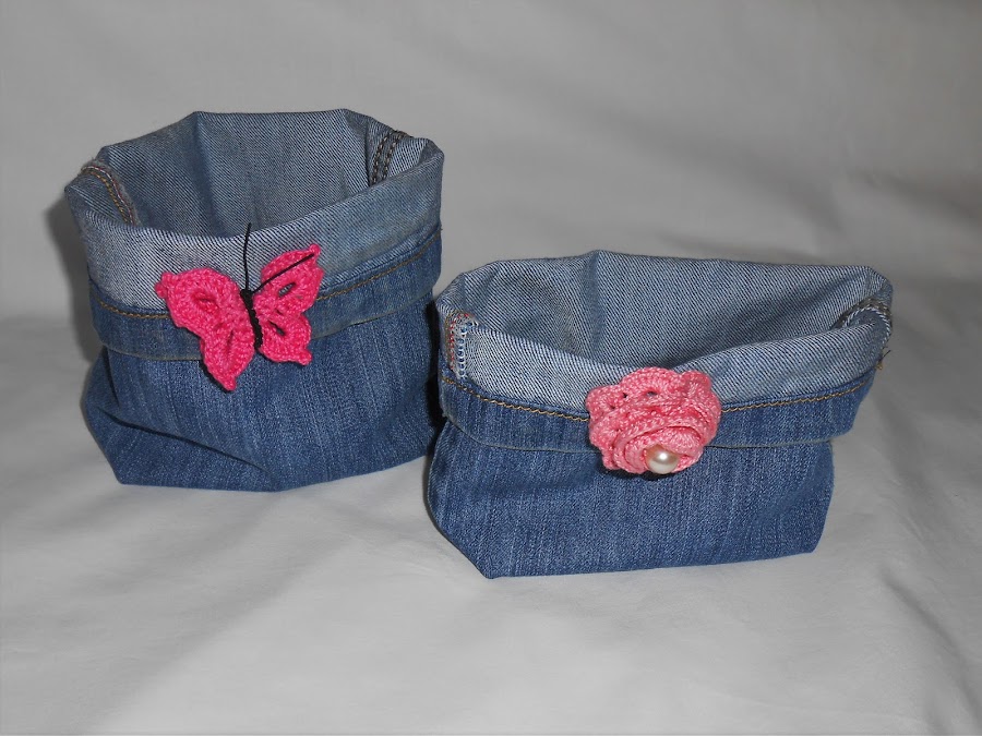 Por ahora, os enseñamos una de ellas...Unas cestas hechas con las patas de los vaqueros y un pequeño detalle para darle color.