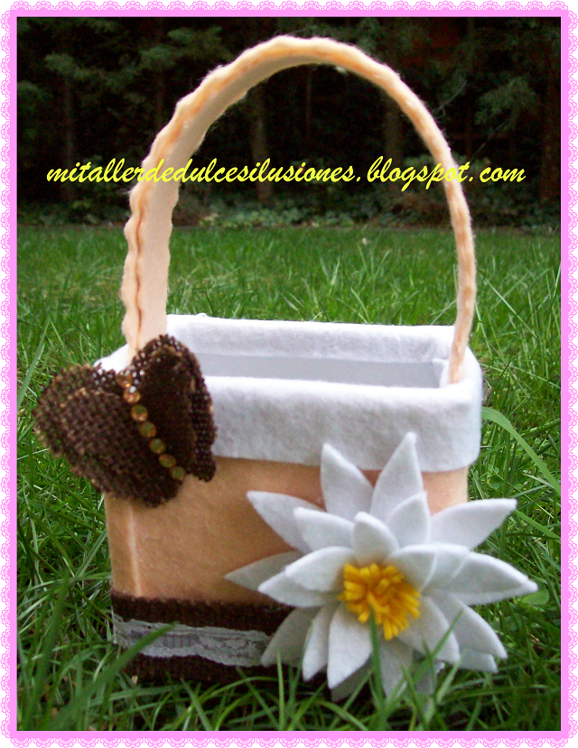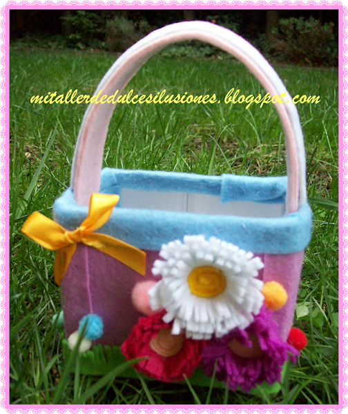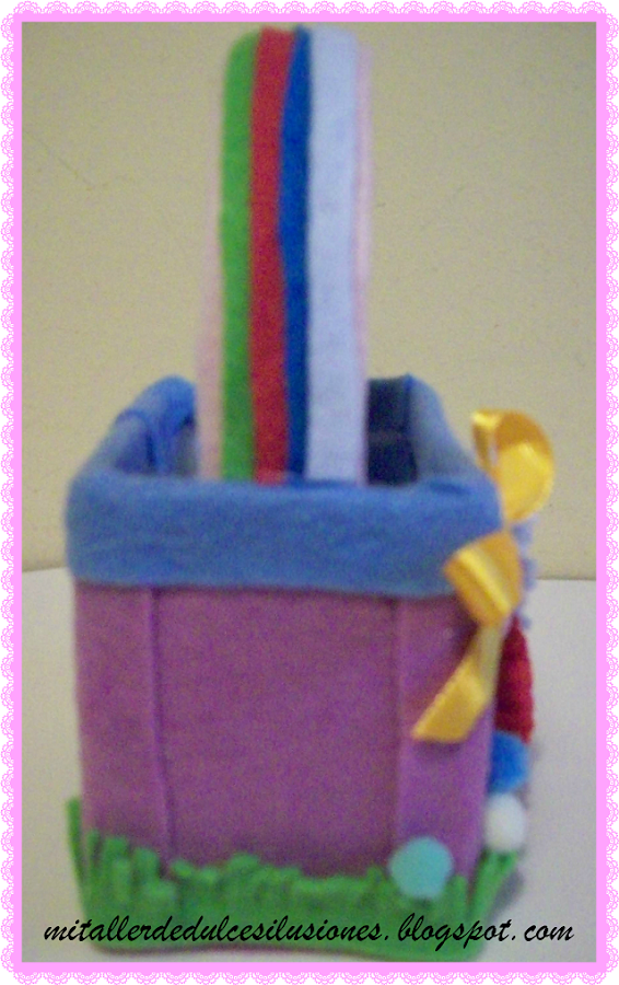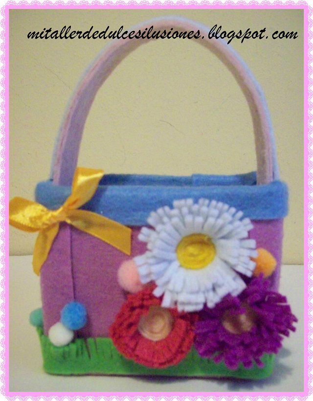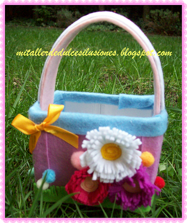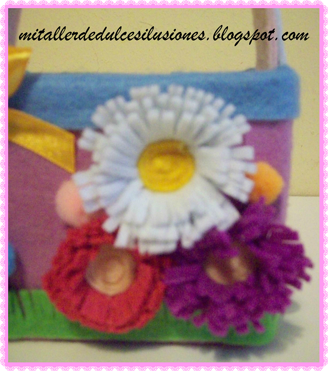 Para la de colorines yo he hecho unas margaritas de fieltro que podéis aprender hacer pinchando AQUÍ y que son muy fáciles de hacer,he puesto un lazo amarillo,en el asa he simulado un arco iris de poquitos colores y he pegado algún pompom para acabar la decoración.