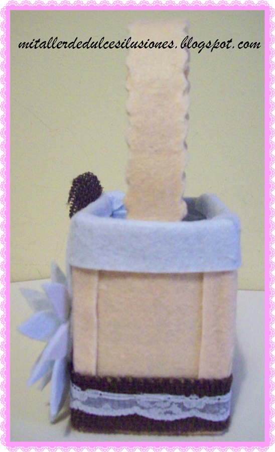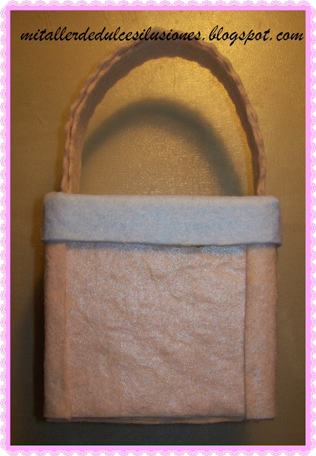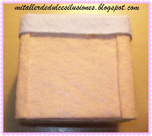 3.Aunque no lo parezca el siguiente paso es muy fácil,sólo tenéis que pegar con la pistola de pegamento las caras de fieltro,recordar que cada cara lleva dos trozos de fieltro,podéis coger una tira y pegarla en las esquinas para darle una bonita terminación.También tenéis que montar el asa pegando tira de fieltro,cartón y tira de fieltro,le dáis forma redondeada con las manos.