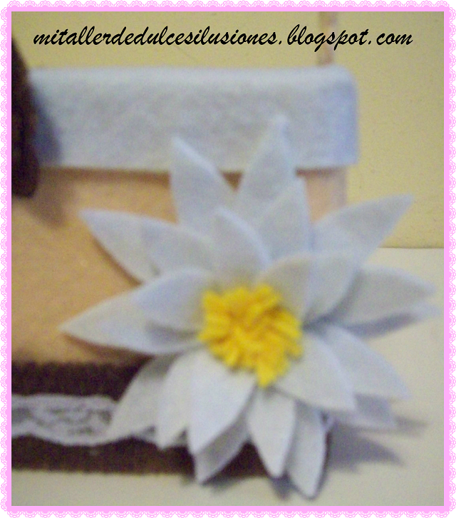 4.Llega el momento de la decoración,yo he hecho dos estilos uno vintage y otro más colorido y divertido.Para el vintage necesitáis tela de arpillerí(es lo mismo que tela de saco),encaje y algún brillo,he puesto una flor de loto hecha de fieltro,que es muy sencilla de hacer,y sólo tenéis que ir pegando pieza a pieza con cuidado y sin dejar restos de pegamento.