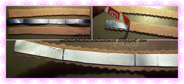Para el asa cortaremos una tira del cartón que nos ha sobrado y dos tiras de fieltro del mismo largo pero un poquito más ancha,con unos milímetros por cada lado es suficiente.