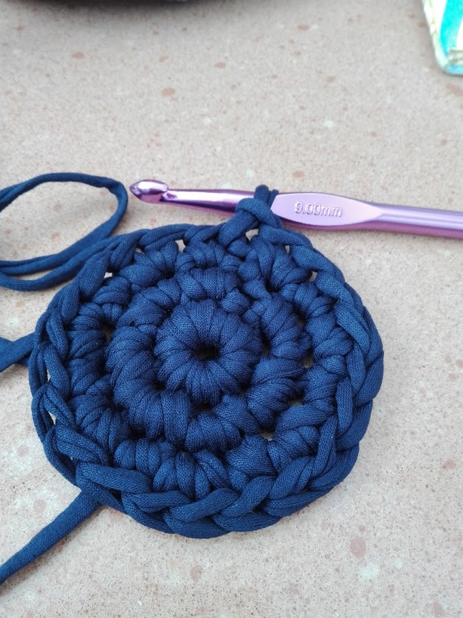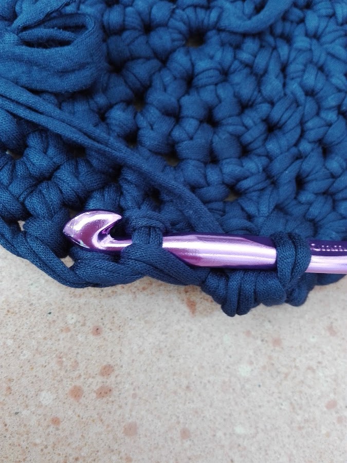 A continuación sube entre los puntos el lazo que te quede para seguir tejiendo en círculo alrededor de la primera vuelta de la base cogiendo la cadeneta completa.
