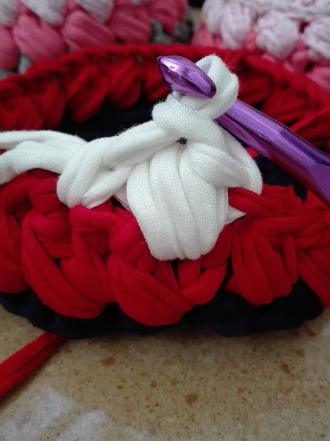 Al tejer la segunda vuelta de subida, en el primer punto tejemos un punto popcorn, el segundo no lo tejemos, en el tercero hacemos un punto bajo para a continuación tejer el punto anterior, el que habíamos dejado tejer, con un punto popcorn.
