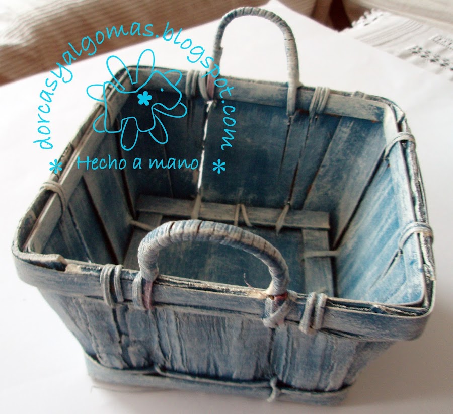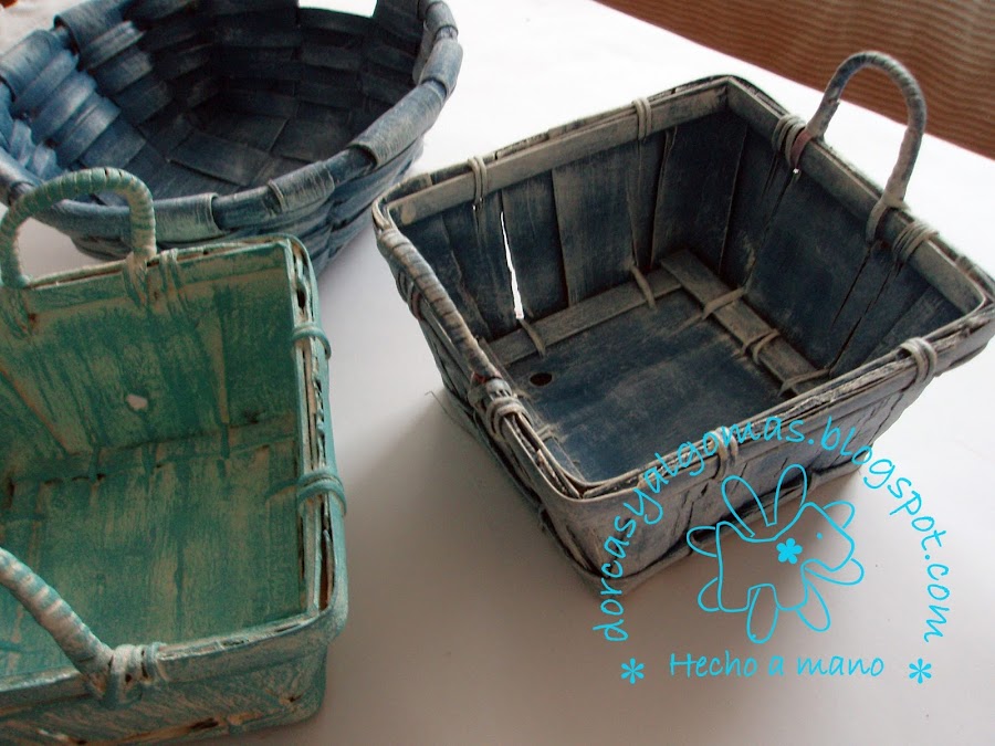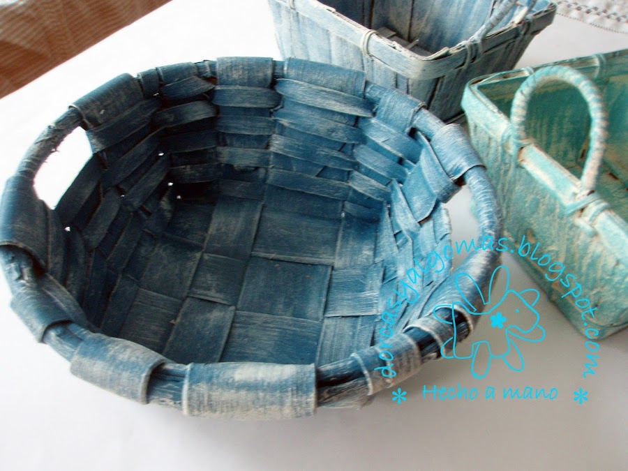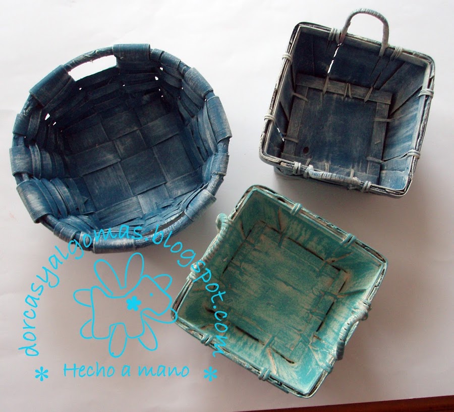 Se tratan de unas cestas que tenía en casa y que he pintado con las Chalking Paint en tonos azules y beis clarito.