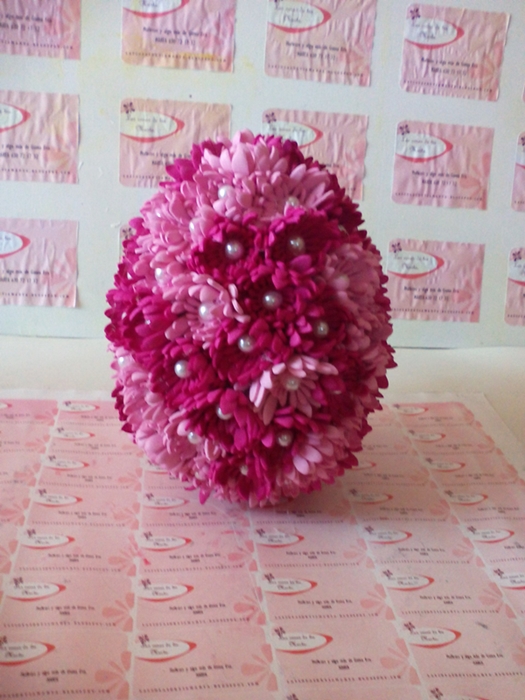 La verde ésta la enrollaremos en el asa y le iremos colocando en ella las florecillas alternando el color o como más nos guste.