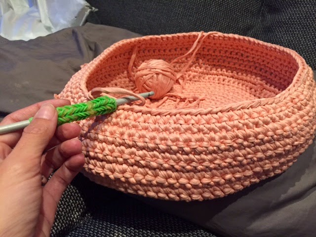 Cuando la base sea del tamaño del que queremos hacer la cesta, dejaremos de añadir puntos e iremos pasando vueltas hasta que la pared de la cesta adquiera la altura que deseamos.