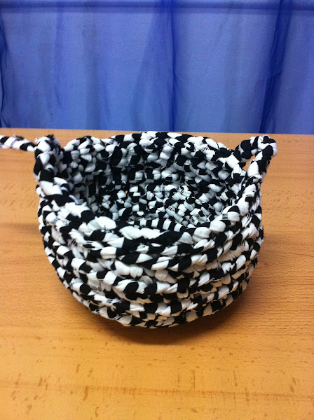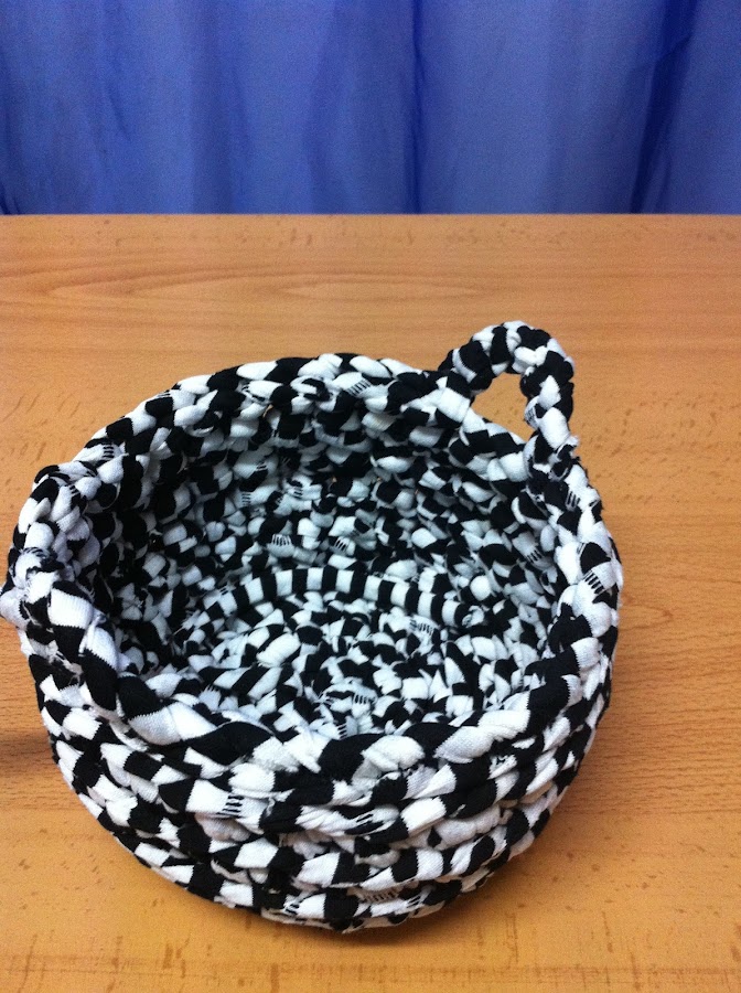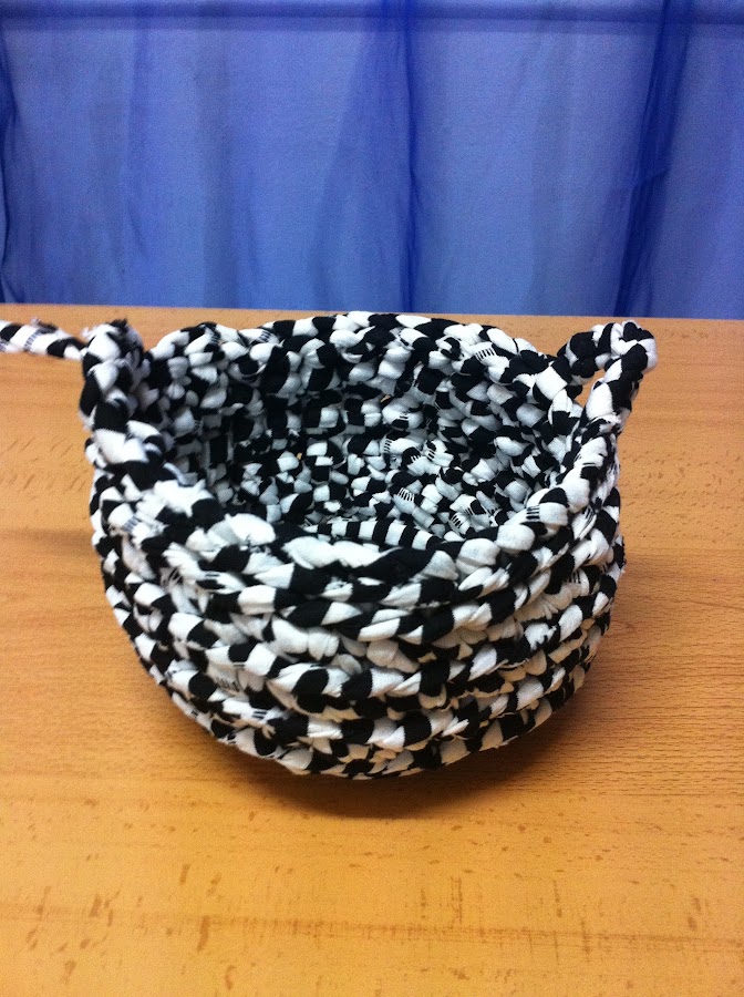 Buenas a tod@s.Esta vez os enseño algo que hice con trapillo. Espero que os guste. Esto es un cestito pequeño del tamaño de las cajitas de algodones para los oidos También os enseño esta bombonera o cesto con tapa y un salvamantel el trapillo lo compre, es un ovillo la cantidad que use para las tres cosas.