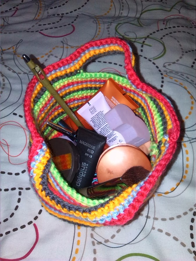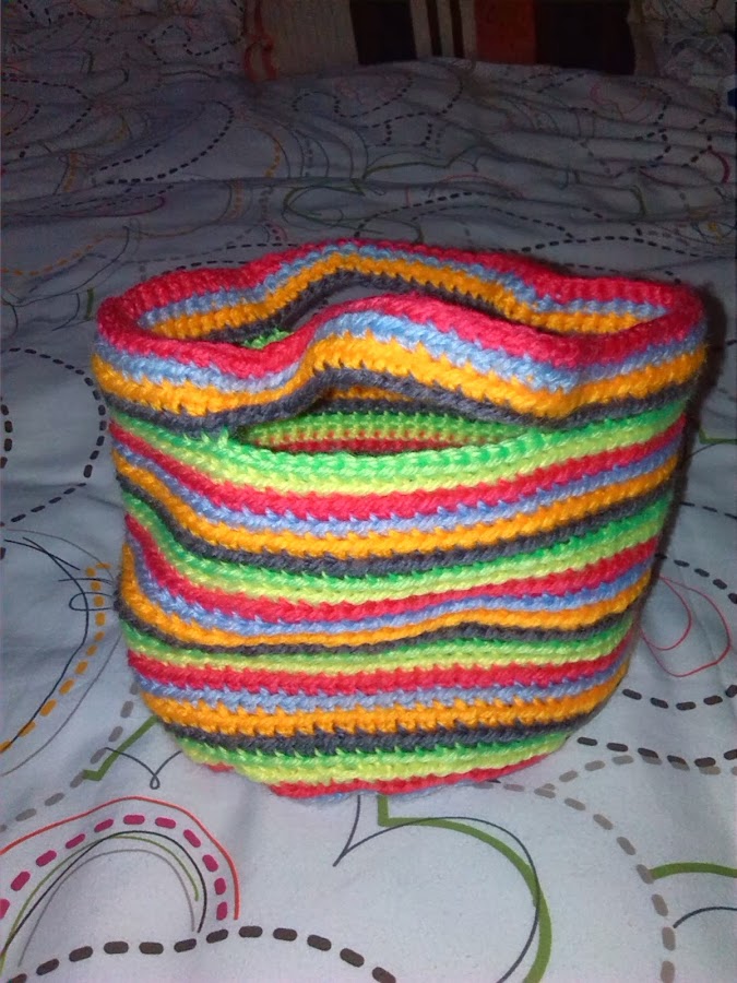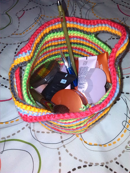 Al principio no hacia nada en concreto, solo probaba puntos y hacia y deshacía, hasta que empecé a hacer un cirulo de colores y cunado lo tenia mas o menos grande tense, pues porque no hacer un cestillo, y manos a la obra me puse.. no llevaba contados puntos, ni sabia muy bien que iba a pasar, pero después de vuelta, y vuelta y vuelta...al final lo que surgio fue: