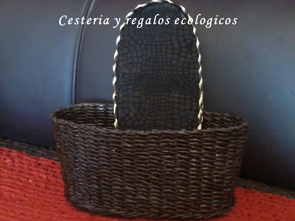 Cesto tejido con tiras de papel, multiusos con tapa adornada de encaje y trenza bicolor.