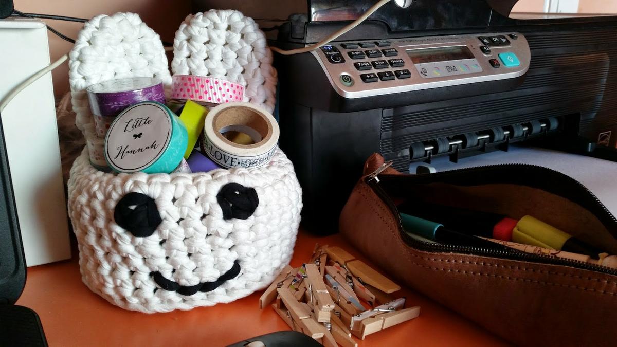 Es muy sencillo de hacer, ya que solo tenemos que añadirle unas orejitas a un cesto normal y hacerle la carita, que en este caso también es de trapillo. En un principio tenía esta otra, pero me resultaba algo rara...