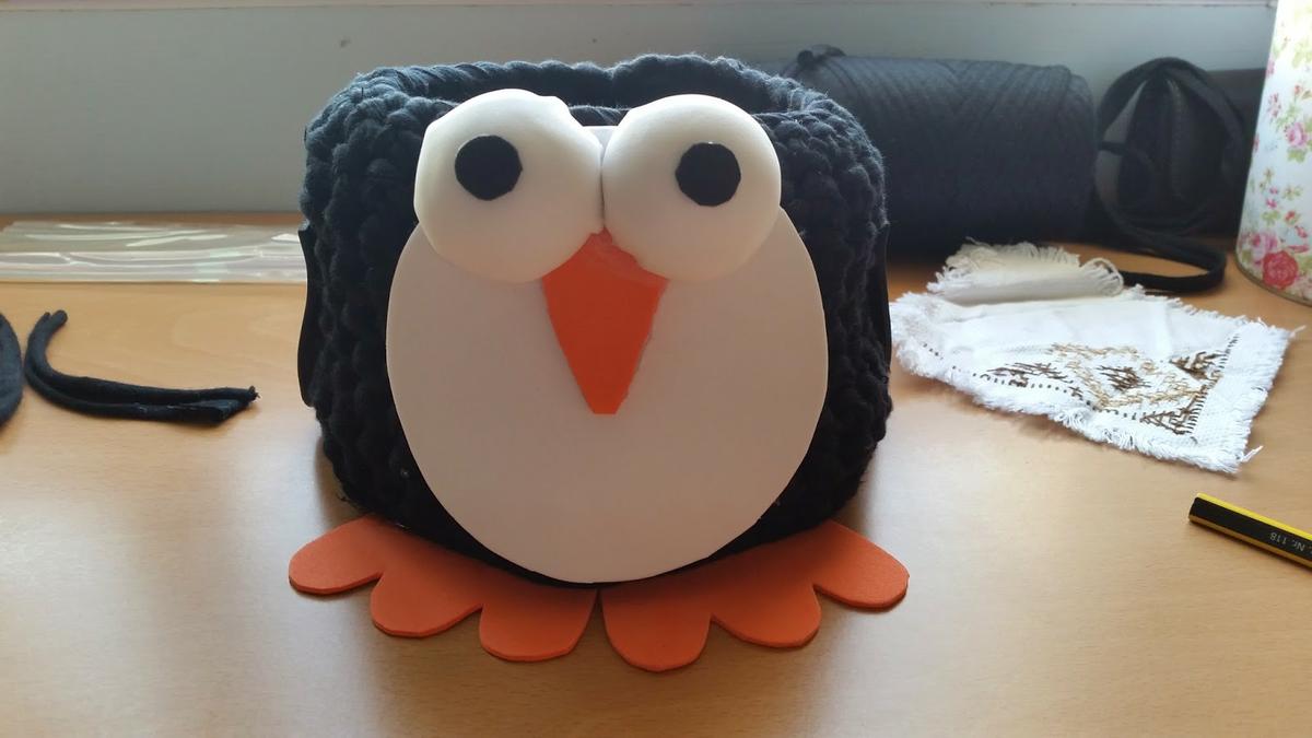 Como extra te enseño uno que hice hace algo más de un mes como regalo a una chica a la que le encantan los pingüinos. La foto no es muy buena, pero es que se me pasó realizarle su propia sesión fotográfica. En este caso, los detalles están realizados con goma eva.