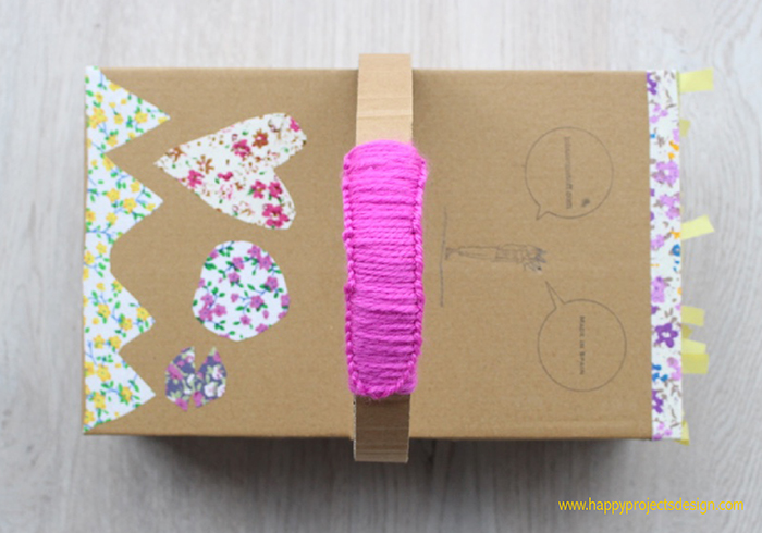 Para el capazo reciclamos un trozo de cartón que previamente decoramos con lana. Encontrarás el tutorial paso a paso en este post que compartí en el blog DecoraTuAlma: