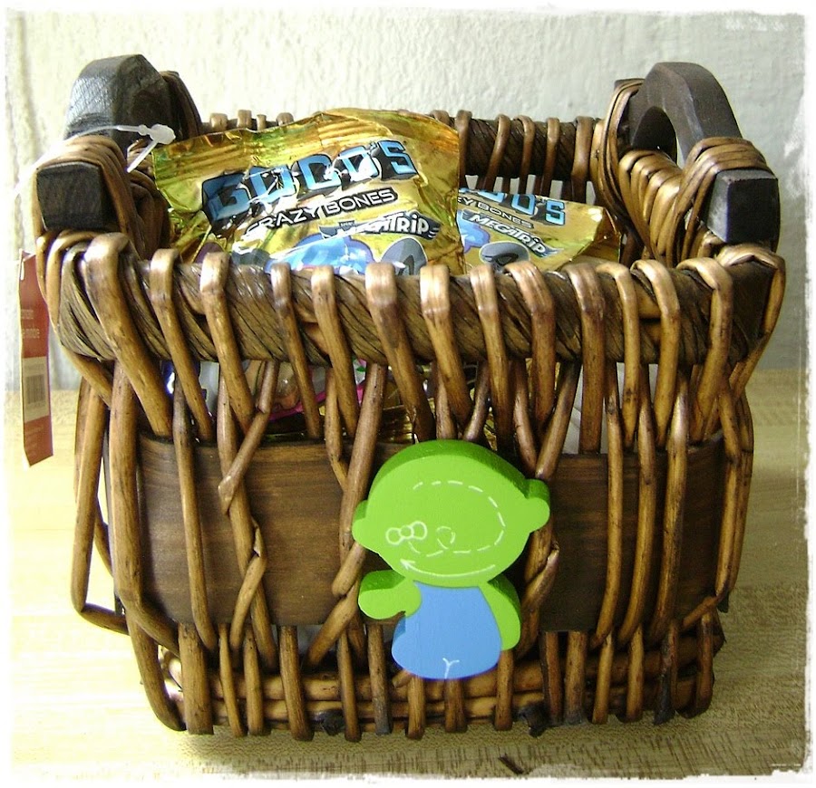 Y para éste último.... compré la cesta, a la destinataria le encantan los gogo"s al igual que a mi hija y se nos ocurrió que sería simpático regalarle un canastico para que guardara toda su colección. Mi hija hizo el dibujo, luego lo calé y pinté y por último mi hija le hizo los detalles.