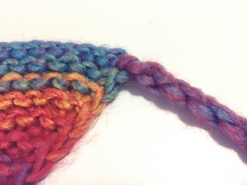 Retuerce la hebra hasta que ofrezca resistencia, introdúcela entre los puntos de la esquina y al doblarla por la mitad se volverá a retorcer. Haz un nudo en el extremo.