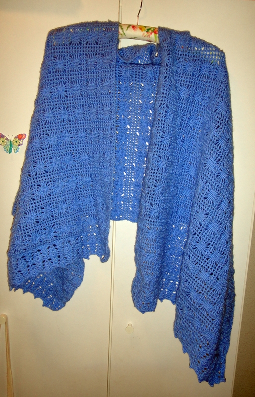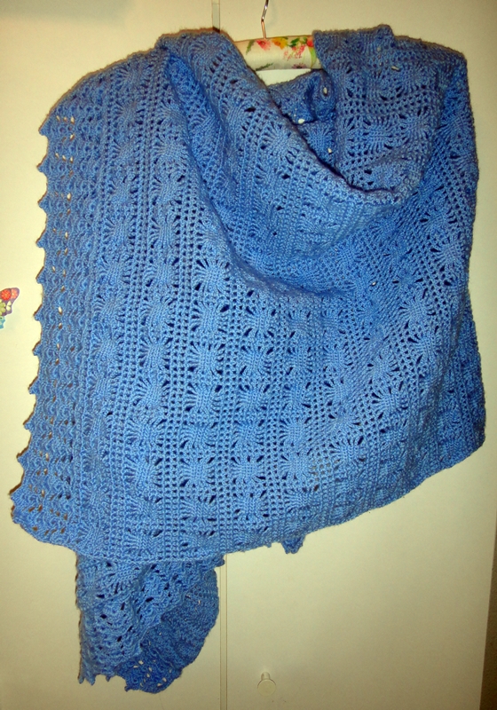 Cuando tienes un peque que no llega a dos años (los cumple la semana que viene) al que dormir por las noches le parece un rollo, necesitas algo para arroparte en mitad de la gélida madrugada. Bueno, tampoco hace tanto frío, que tenemos calefacción. Pero si que sienta mal tener que salir de la cama calentita, llegar hasta la cuna... en fin, los que tengáis niños resistentes al sueño me entenderéis. La solución, hasta que el pequeño decida dormir la noche entera, es arroparme con este chal azul.