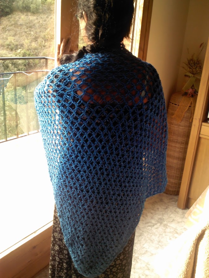 ¡Qué chal más bonito, me ha encantado! Era uno de esos miles de patrones agazapados, esperando la oportunidad de salir.... Y no desaproveché la oportunidad. Lo cierto es que me equivoqué al coger el color para el mini chal que me habían encargado (AQUÍ) y decidí quedármelo y hacerme uno para mí. Y terminado justito a tiempo para estrenarlo en Nochevieja ¡Iba yo más contenta y orgullosa...! Supong ...
