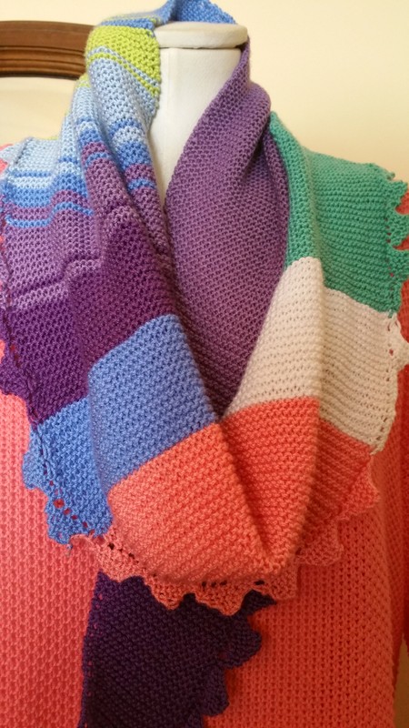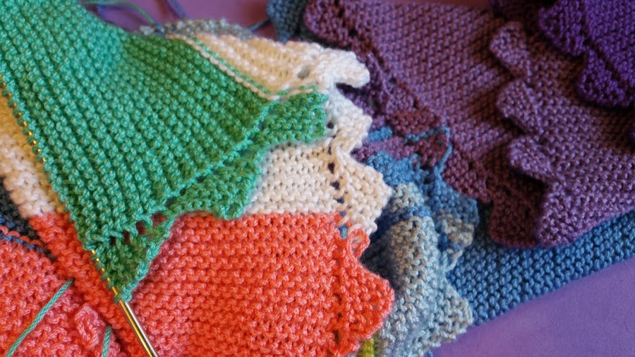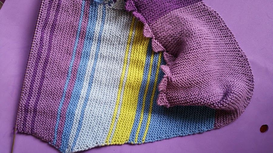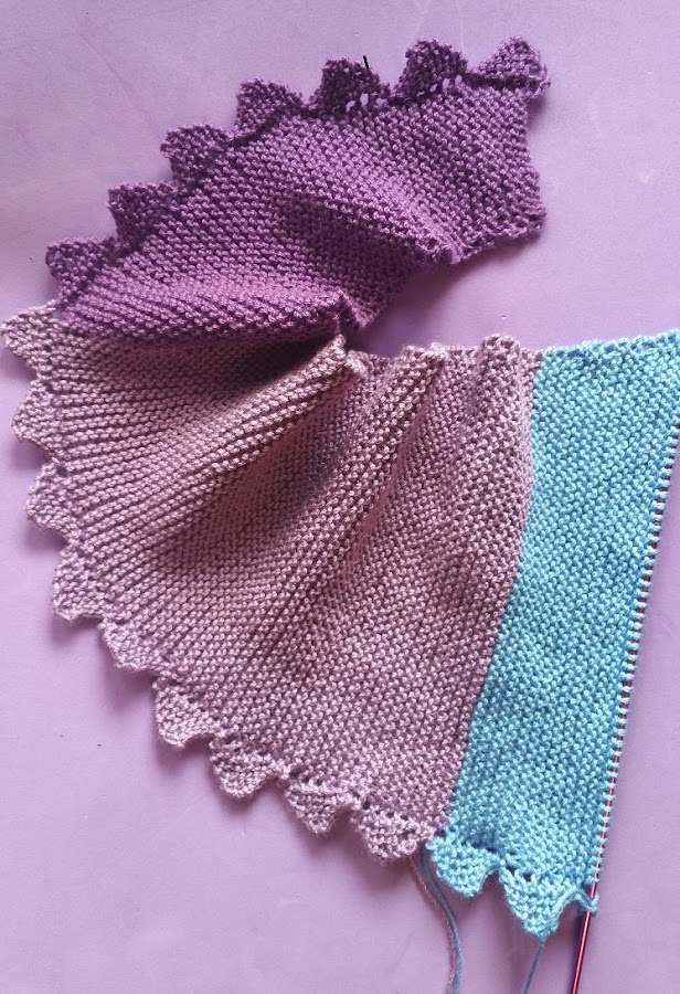 MI APORTACIÓN SON LOS PIQUITOS QUE BORDEAN el chal, los he hecho aumentando 1 punto antes del último punto de la parte que va recta, cada vuelta, hasta completar 5, que cierro de una vez, y vuelta a empezar en el siguiente con otra lazada