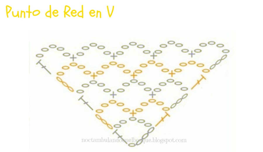 Este chal está hecho de punto de red en su totalidad, por lo que os va a resultar muy sencillo de hacer en cuanto llevéis un par de vueltas. Aquí abajo os dejo el gráfico del punto de red en v.