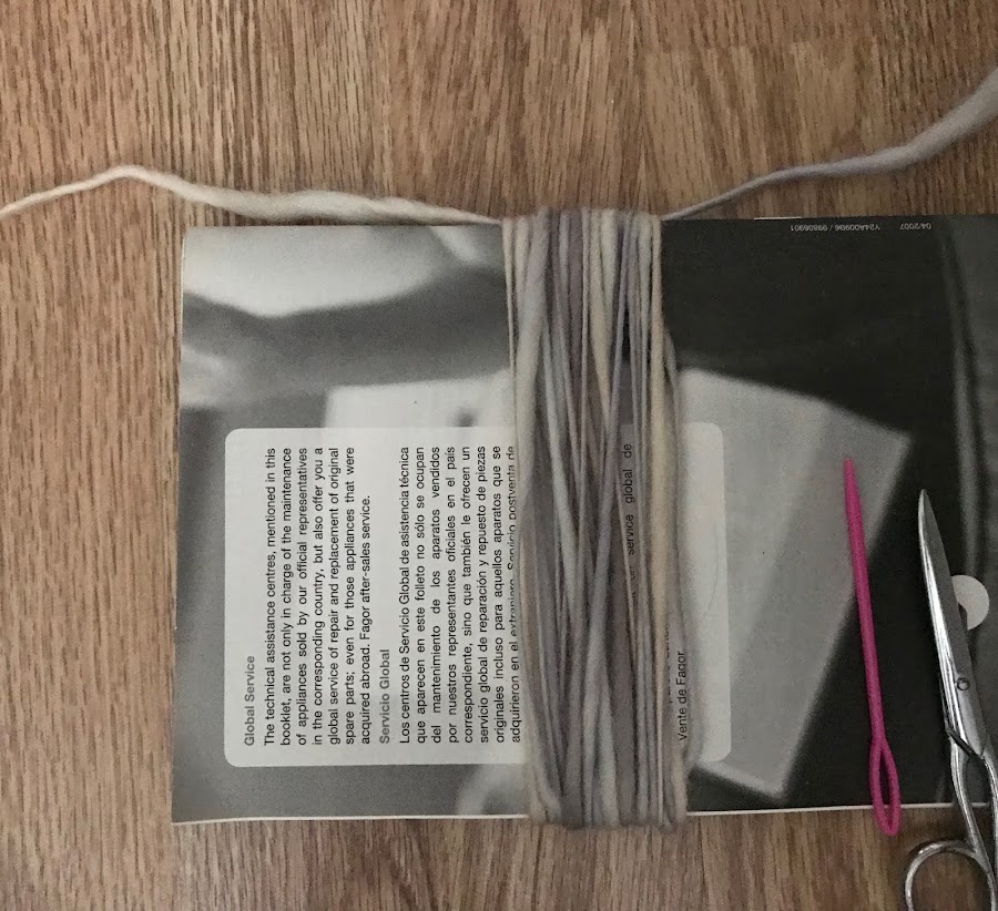 4.- Hacemos 3 borlas de la siguiente manera: cogemos un libro o un cartón que mida de largo 15 cm. Ponemos una hebra en horizontal y pasamos el ovillo todo alrededor del cartón hasta completar 25 vueltas.