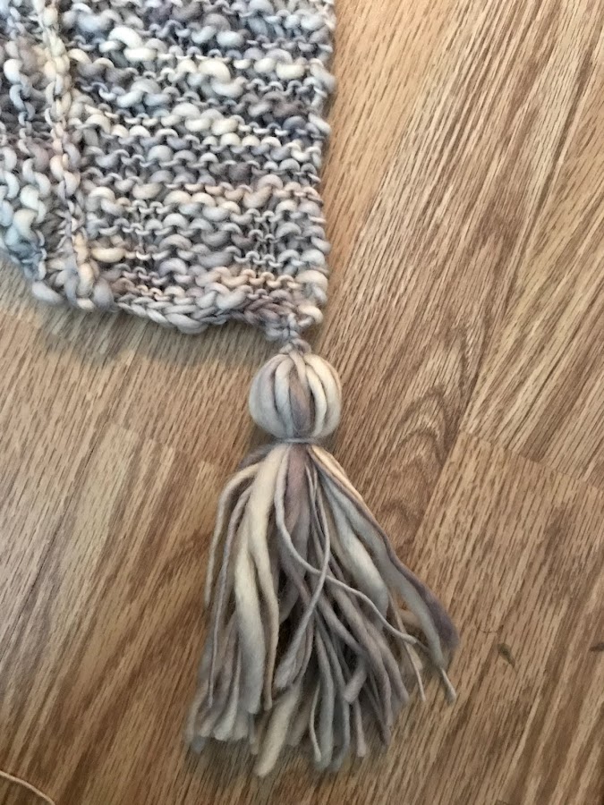 Con ayuda de una aguja lanera cosemos las borlas en los tres extremos del chal.