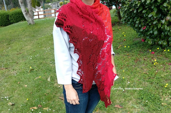 El patrón es sencillo de seguir y como vas repitiendo siempre el mismo motivo cuando llevas un rato ya no necesitas consultarlo en cada vuelta, sólo de vez en cuando. Yo seguí repitiendo el bloque de hojas para terminar la segunda madeja, no quiero restos de lana. Me quedó grandecito, el lado largo del chal mide 174 cm. No está nada mal, ¿eh?