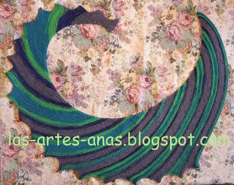 Cuando lo tengáis tejido, conviene bloquearlo, para dar forma, poniendo los alfileres respetando la forma natural del chal, sin estirar, simplemente asentar, así toda la noche