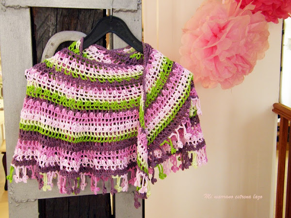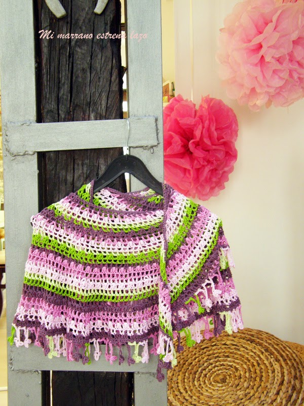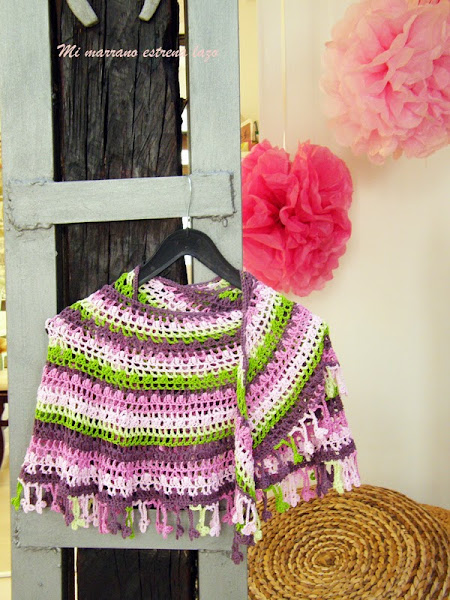 Así que para esas gargantas que enseguida se enfrían, os traigo un chal muy bonito y alegre. Está realizado con algodón 100 % de Natura, con unos colores muy bonitos, y un remate que tengo que decir, me llevó más tiempo hacer que el propio chal, solo con la plancha estuve 1 hora!!!! Pero creo que mereció la pena ¿Que me decís?