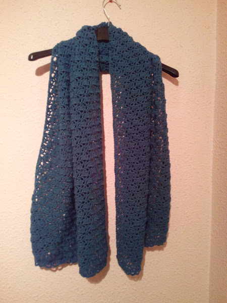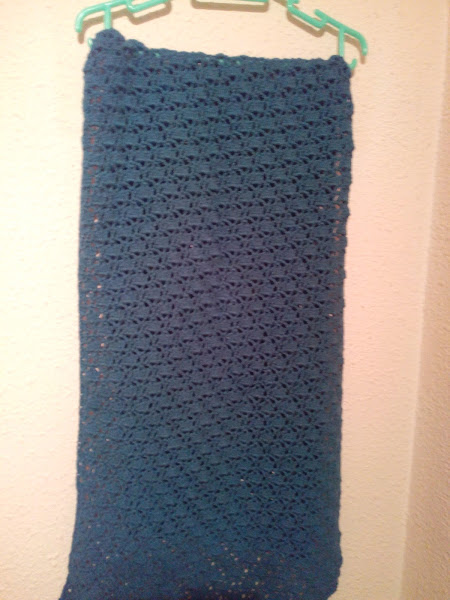 Seguimos con los regalos de Navidad... Os enseño el chal-bufanda que hice para mi madrina. Usé la lana Nausicaa, mezcla de merino 20% y Bambú-viscosa al 80%, en color azul petroleo. Es una lana que da gusto tejer, porque tiene mucho peso y una buena caída, y un acabado fantástico, sobre todo si no os gusta que el aspecto quede "peludito". De precio, está regular... sale aproximadamente por 3.5 euros la madeja de 50 gramos, y yo usé unas 7 madejas para hacer esta bufanda, usando una aguja del 4.5.