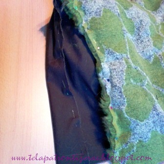 Y una vez dado la vuelta, unimos los costados del satén por su lado y los de la piel juntos.
