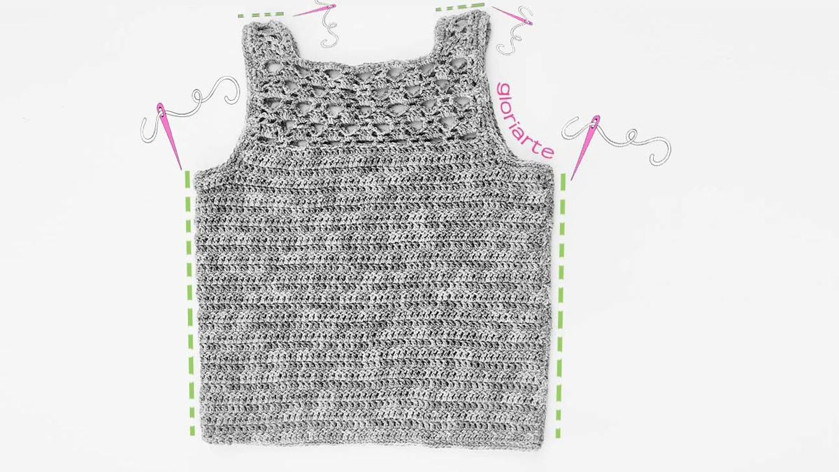 Juntar las 2 piezas (derecho con derecho) y coser los costados hasta la altura de la sisa. Coser los hombros en la parte superior: