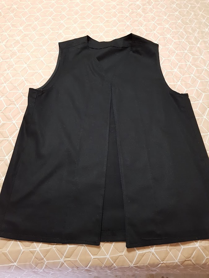 En la parte delantera y en el cuello lleva istas del mismo tejido y en las sisas lleva cinta al bies de algodon de color negro.