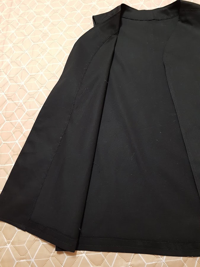 El modelo del chaleco es mas bien anchito y de largo por la cadera , tiene forma redondeado en el delantero y costura de adorno en los hombros.