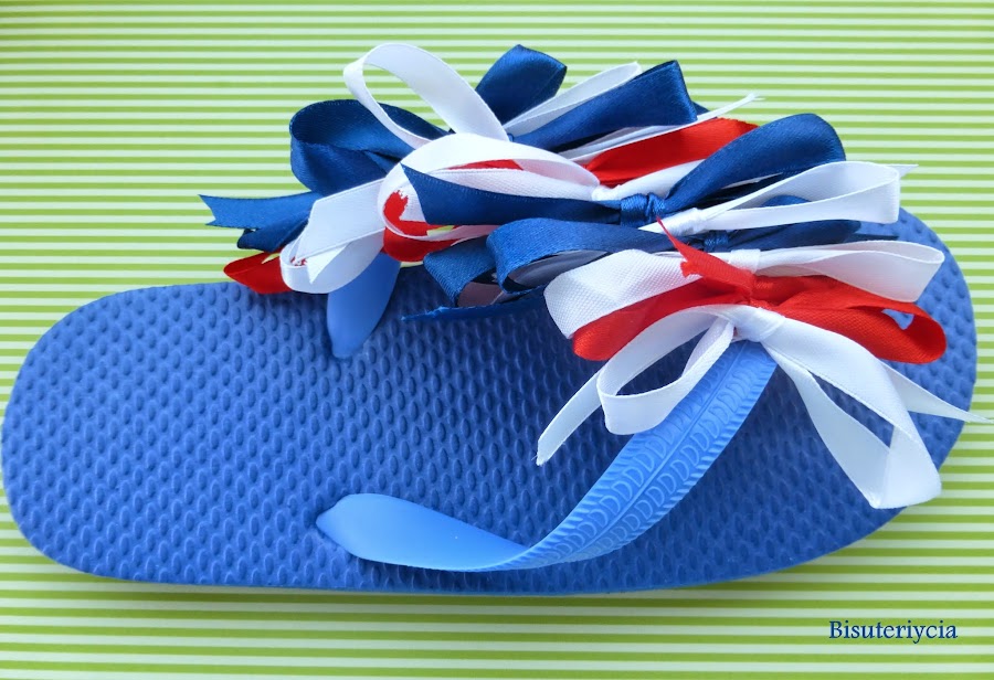 Una vez tengamos las cintas cortadas iremos haciendo lazitos alrededor de las tiras de la chancleta.