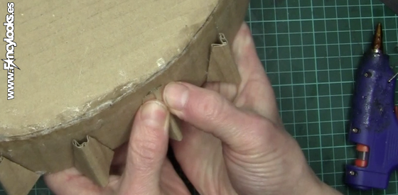 Pegamos esta tira de cartón alrededor del borde de la circunferencia con más silicona caliente, ajustando el tamaño del perímetro y cortando lo que sobre.