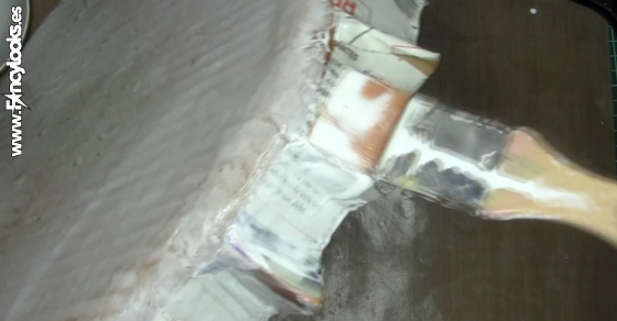Ya tenemos listo el esqueleto de la chapa. Le pego papel de embalaje o papel de periódico a toda la parte circular de la chapa utilizando pegamento fuerte Cleocol, que se puede comprar en myba.es, y que tiene la peculiaridad de que apenas arruga el papel. Por los laterales voy cubriendo los picos con tiras de papel de periódico y más pegamento Cleocol, sin pasarles luego una capa de Cleocol por encima, que quede sin cubrir el papel.
