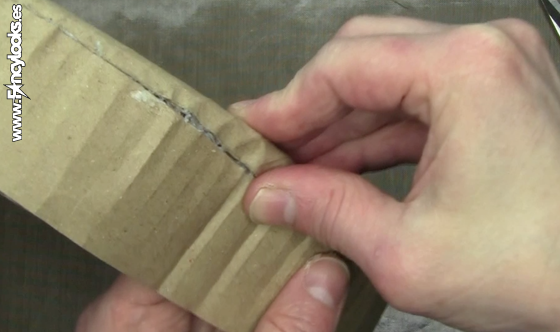 Corto unas tiras de cartón de 3,5 cm de alto. Siguiendo la forma de la plantilla que ofrezco en el archivo descargable y gratuito, voy cortando 21 piezas para formar los 21 picos de la chapa.