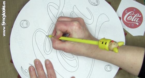 Ahora recortamos el círculo de la plantilla que hemos descargado previamente e impreso para transferir el diseño de las letras a la chapa. Para ello pinto por la parte de atrás con lápiz normal, HB, el contorno de las letras. Pongo la plantilla sobre la chapa y repaso el contorno por encima, por el derecho, así me queda el diseño marcado con el lápiz que está por el revés.