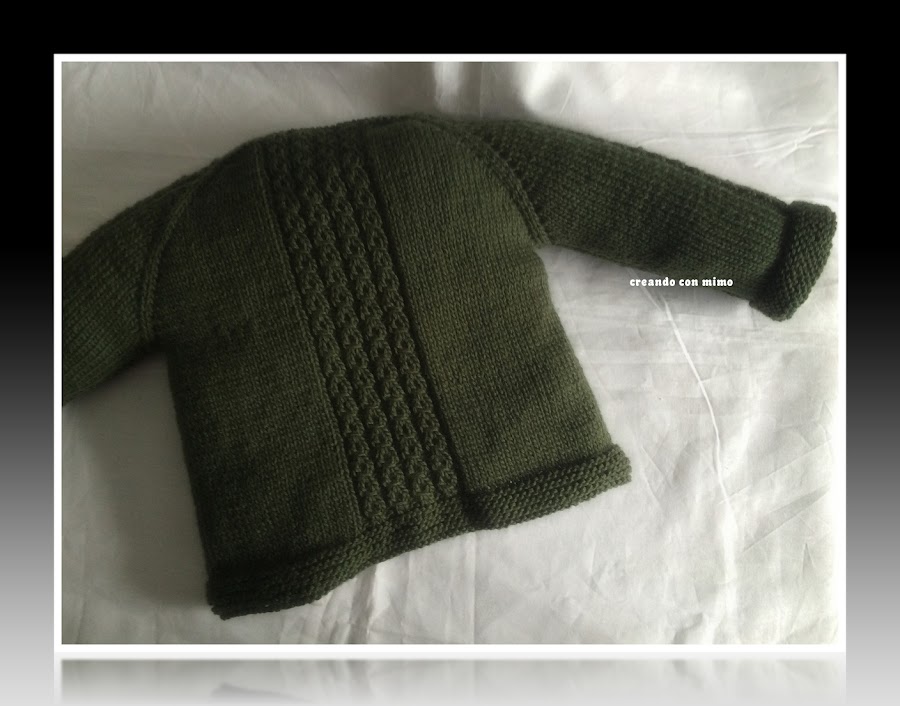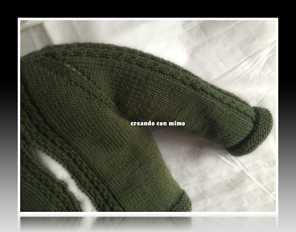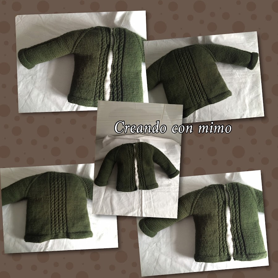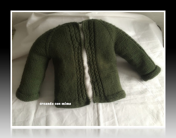 Esta tejida en lana merino verde musgo del 3,5, y el diseño aunque sencillo, lleva unos ochos calados en el centro de la espalda y mangas y en los bordes delanteros.