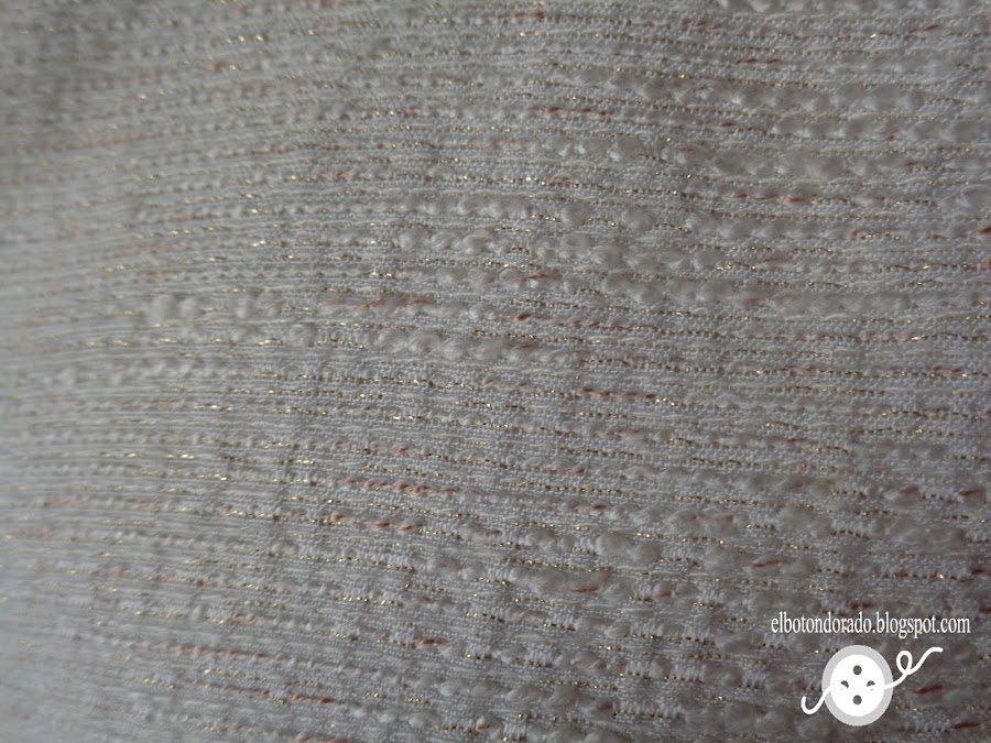 La tela es chanel en color crudo con hilos dorados, se reflejan con la luz y la hacen aún más bonita.