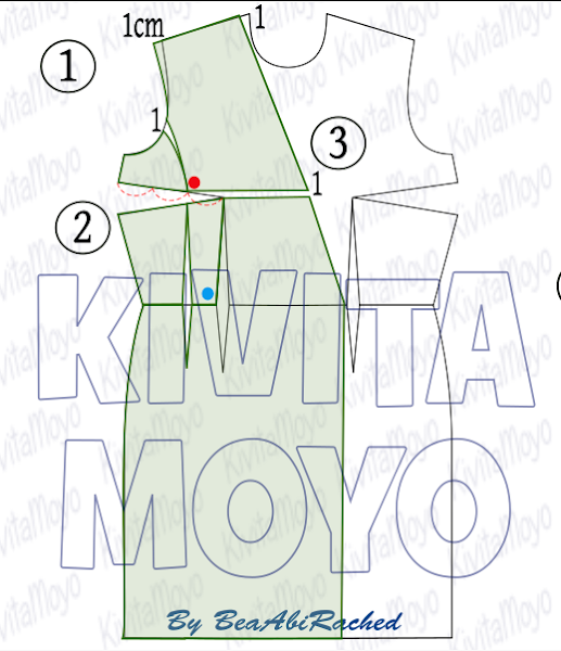 Bajar en bloque el costadillo de la sisa y la parte del cuerpo superior del espacio trazado desde la pinza de busto al centro del patron, como muestran las flechas naranajas.