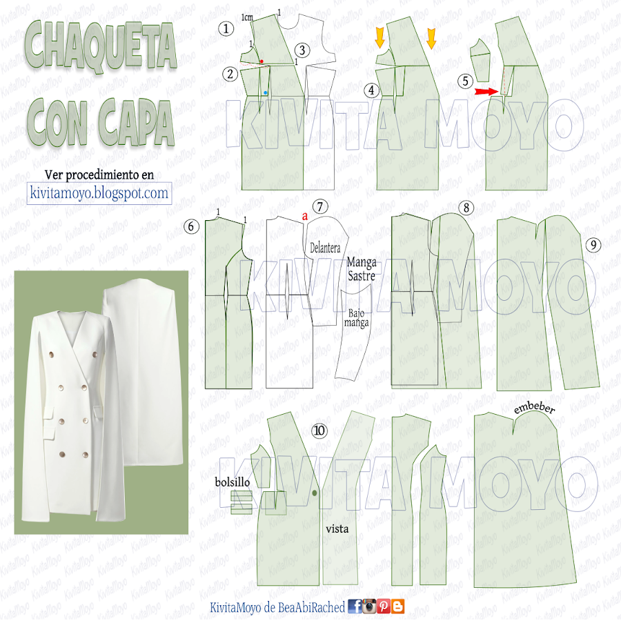 Tomando de referencia el trasero delimitar el largo y ancho de la capa. Tambien descontar 1 cm en escote y darle 1cm extra en el largo del hombro. Dejar una abertura entre la sisa y la cabeza de manga, y dibujara la copa, para luego cerrar el tazo con una linea levemente inclinada hasta el bajo.