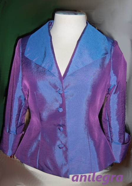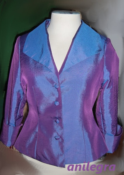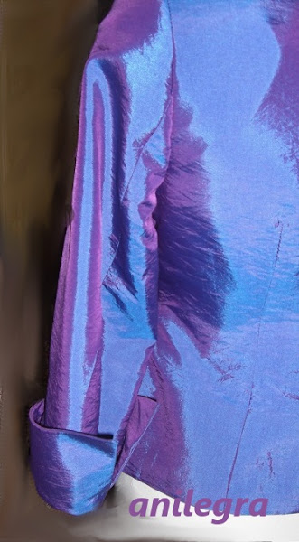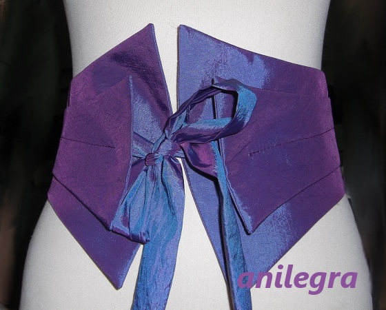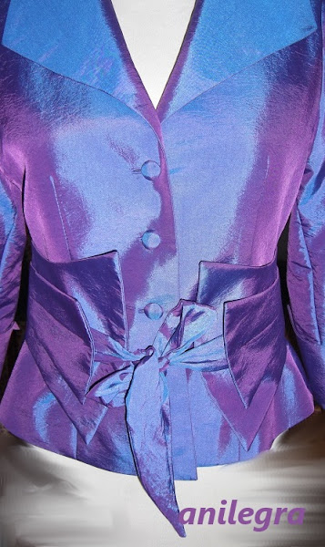 Como la chaqueta ya tenía un color bastante resaltado , y mi clienta lo quería muy ancho y que marcara bien la forma de la cintura ,el fajín lo hice con la misma tela , un "tafetán" tornasolado en tonos malvas y azules