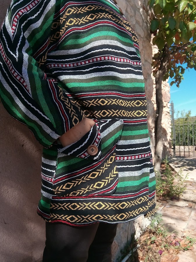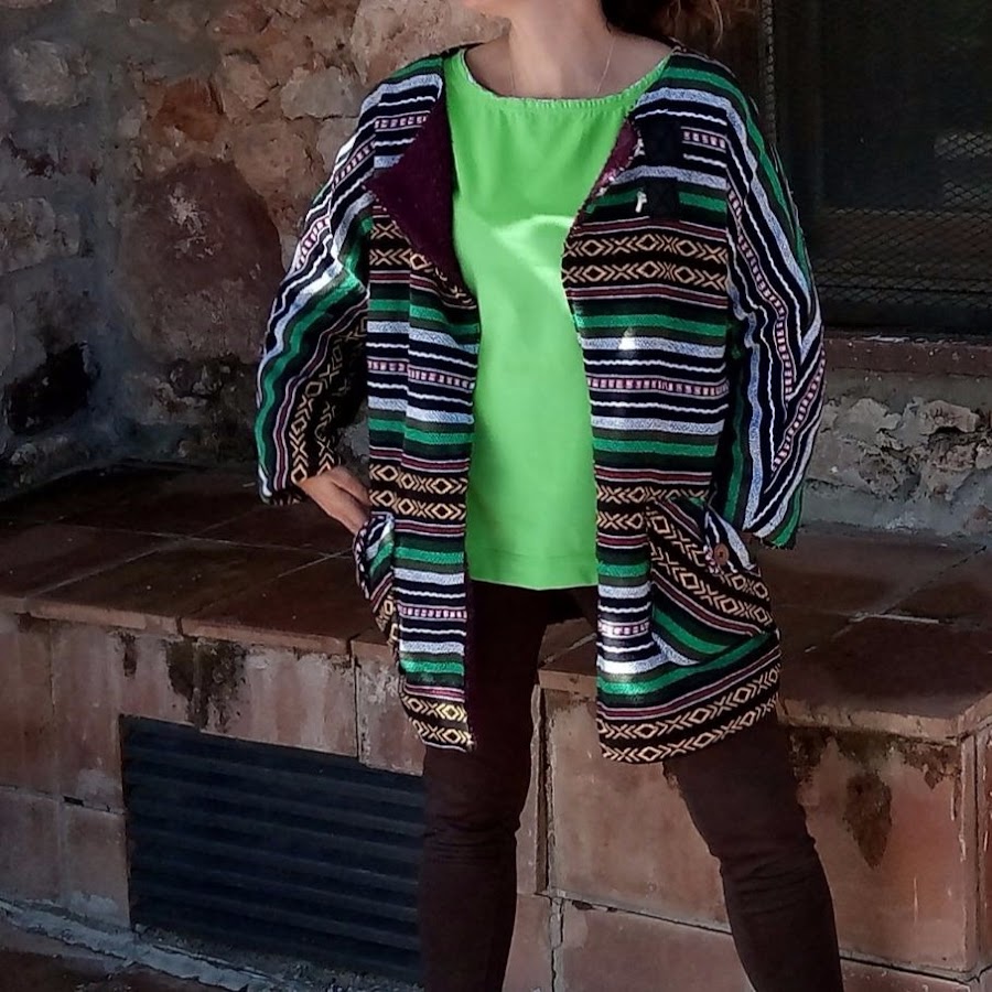 Hacía muchísimo tiempo, casi desde que empecé a coser, que estaba en mi lista de deseos una chaqueta rollo hippie, con tela de esta que no se como se llama (por dios, soy un desastre para los nombres) y el año pasado la encontré en Cal Joan y tenía claro que se iba para casa para convertirse en mi chaqueta preferida.