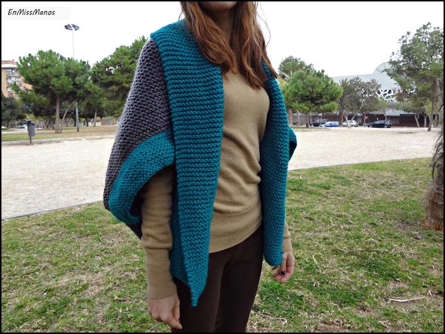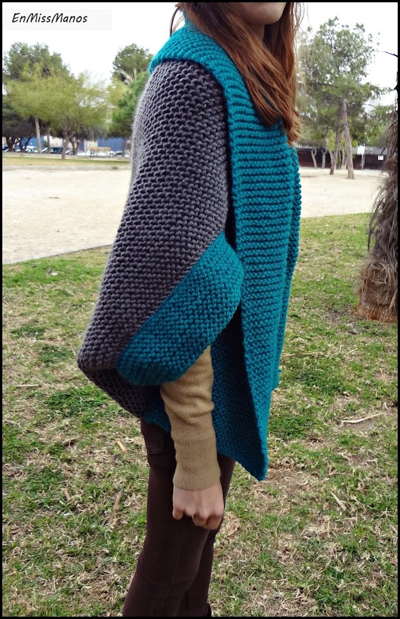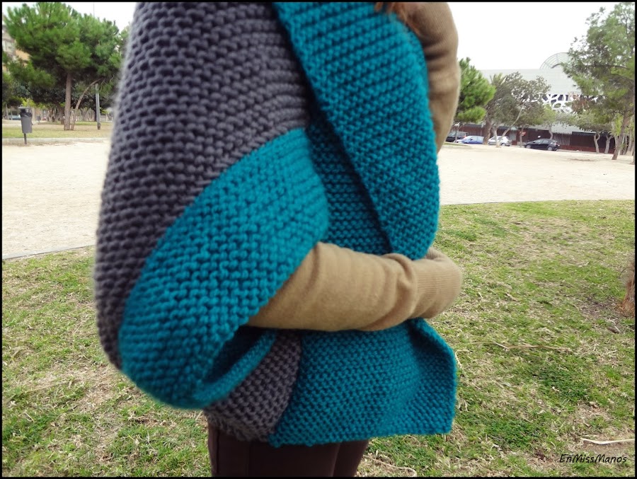 No la terminé a tiempo porque me quedé sin lana gris, ya que la iba a hacer entera de ese color, y tras cansarme de buscar en todas partes esa lana exacta y no tener suerte, opté por continuar las mangas y el cuello en un color turquesa que también me gusta mucho y creo que la combinación de los dos colores queda bien.